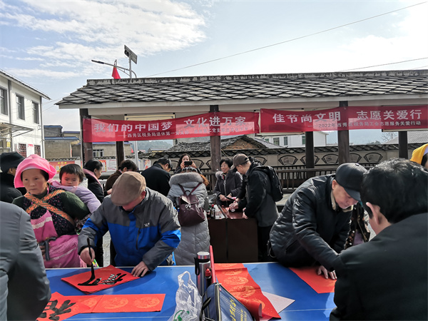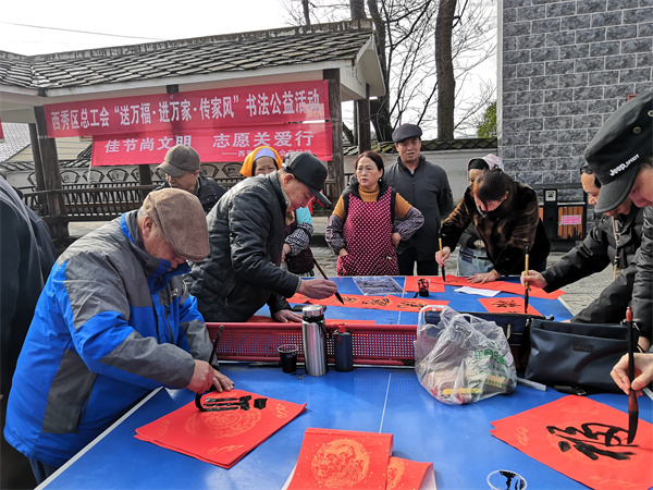 活动现场,受邀的10余位安顺市书法家协会、老年大学书法爱好者倾情挥墨,为每一户村民送上他们喜欢的春联。西秀区税务局退休支部的党员们还为村民送去“福”字帖,与村民拍照留念,共享这份喜悦。