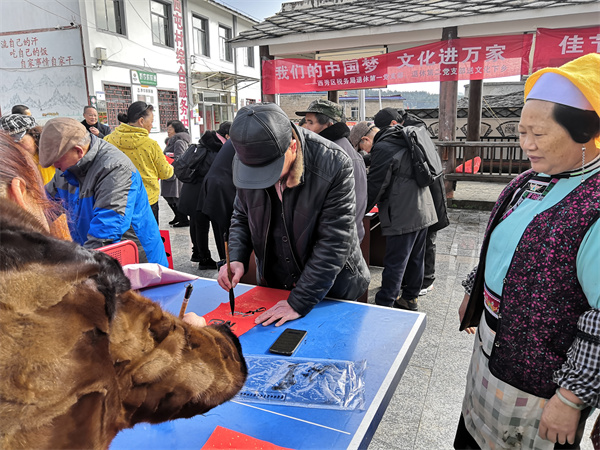 “看着他们在这里写春联,虽然我的字不怎么好看,但我都想写上一副哦,一贴起春联来,感觉这个年味就更浓了!”前来领取春联的村民个个脸上洋溢着迎春接福的微笑。