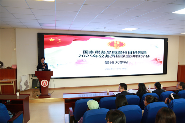 近日,国家税务总局贵州省税务局公务员招考高校宣讲团队分别走进贵州大学、贵州财经大学,开展2025年度公务员招录宣讲推介会,通过主题宣讲、经验交流、报考辅导等方式,吸引更多优秀高校毕业生报考贵州税务。