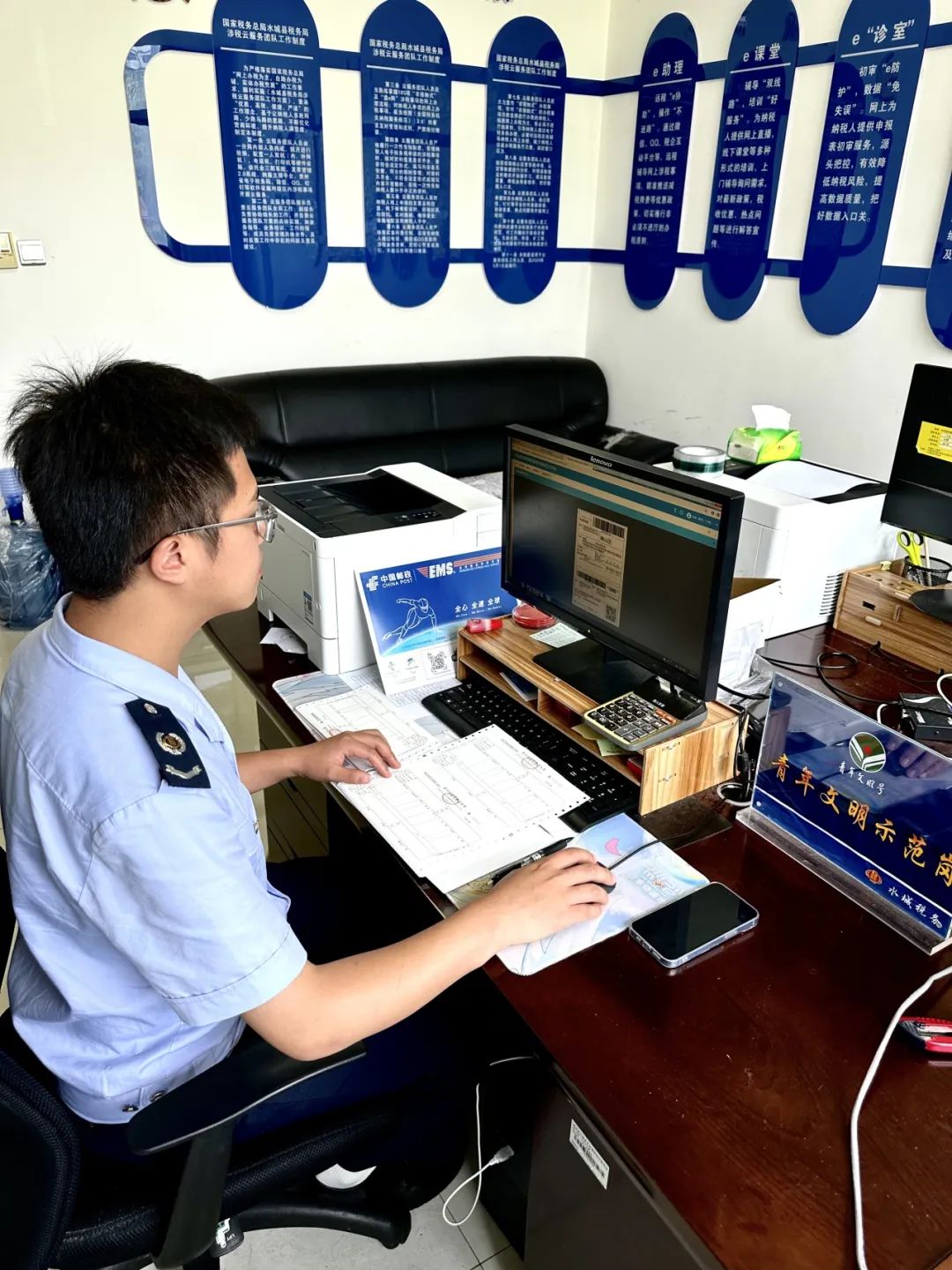 图为“税务e家”工作人员正在为线上领用发票的纳税人办理送票上门手续