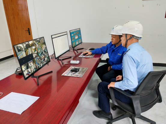 (图为税务干部查看污水处理监控指标并宣讲环保税政策及申报事项)