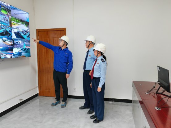 (图为排水公司负责人带领税务干部查看污水处理监控区域)