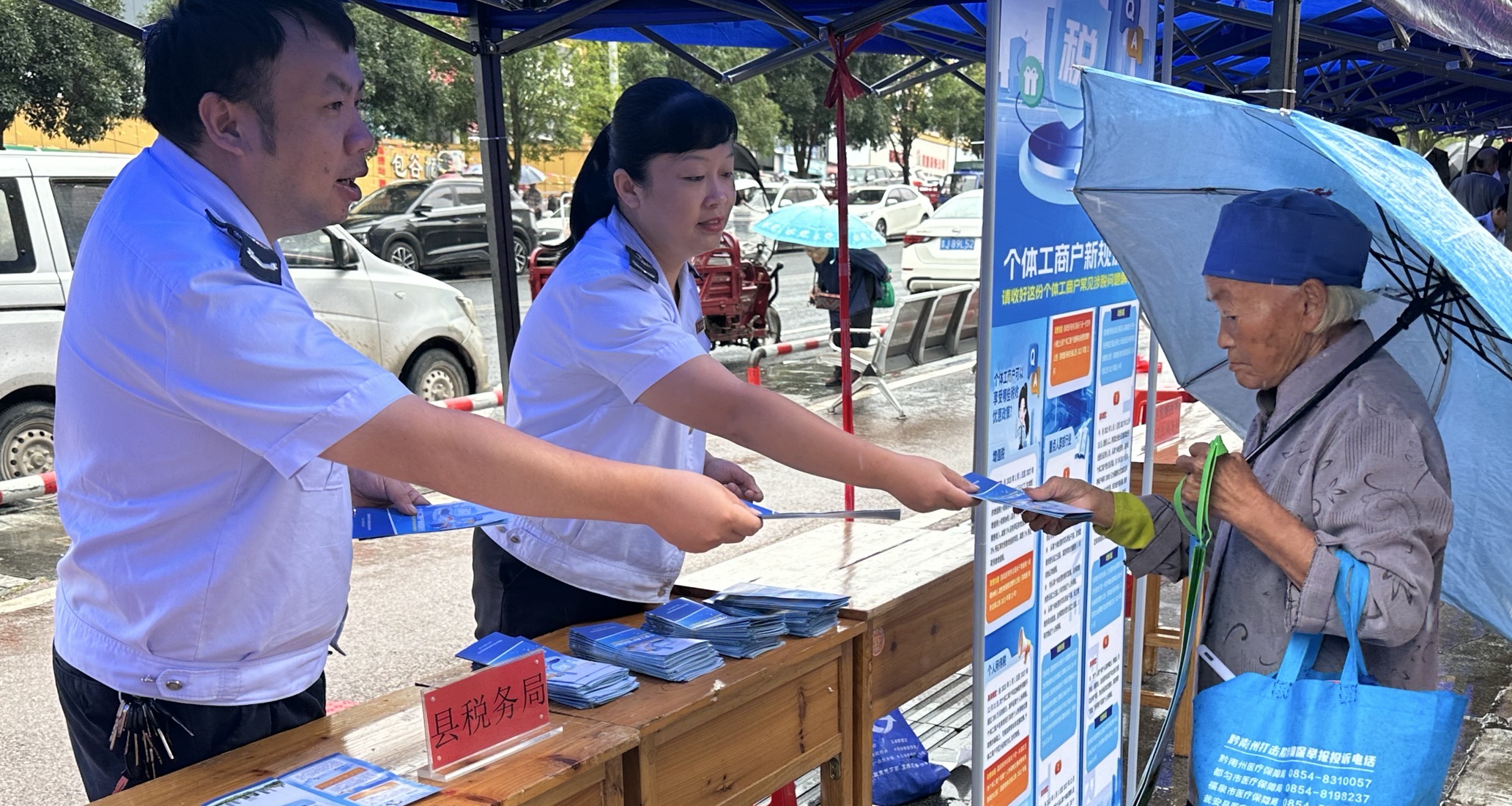 在全国个体工商户服务月活动现场,税务干部以“面对面讲解+一对一答疑”的形式,向往来群众、沿街商户发放《个体工商户税惠政策一本通》《手机版电子税务局操作指南》等宣传资料。