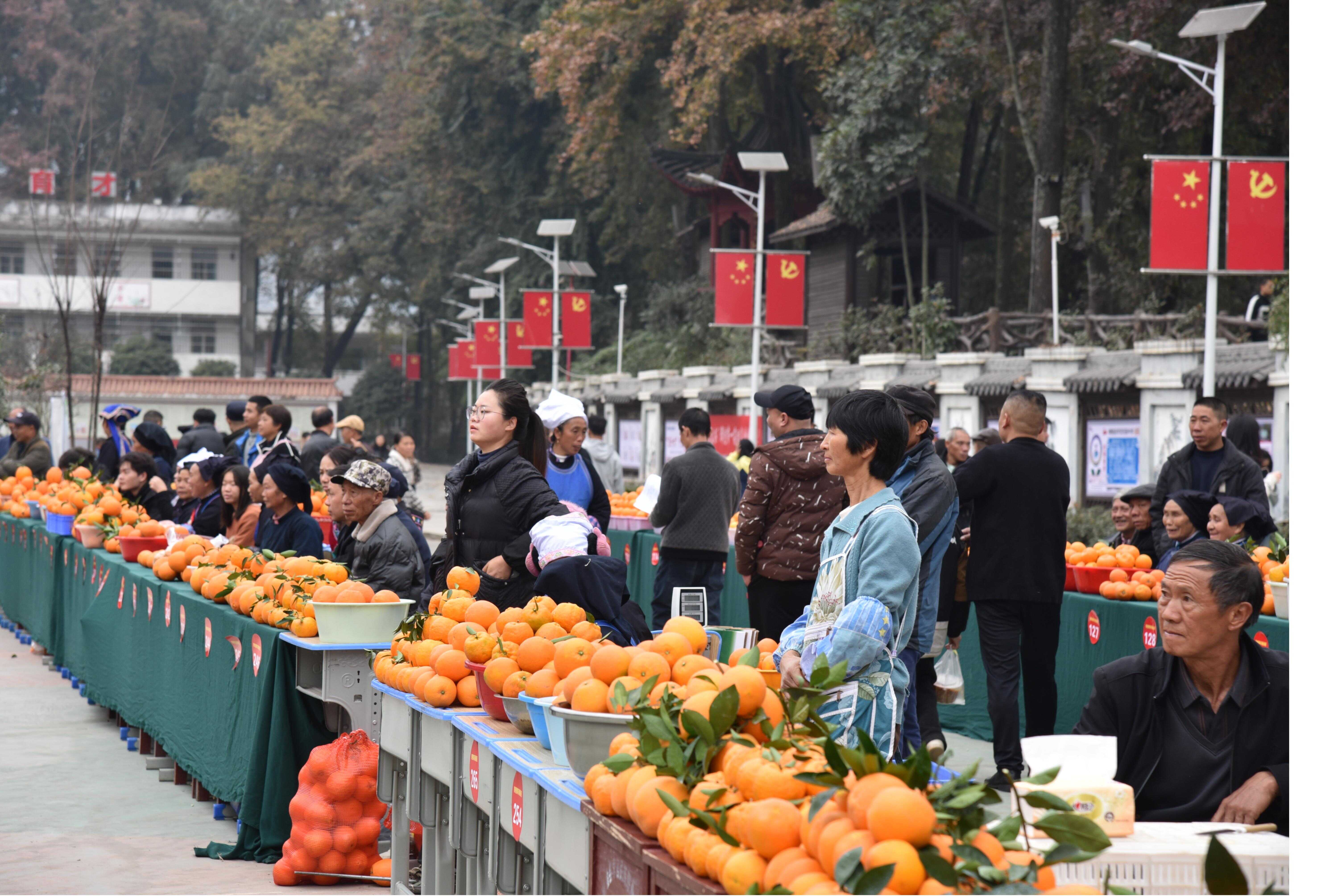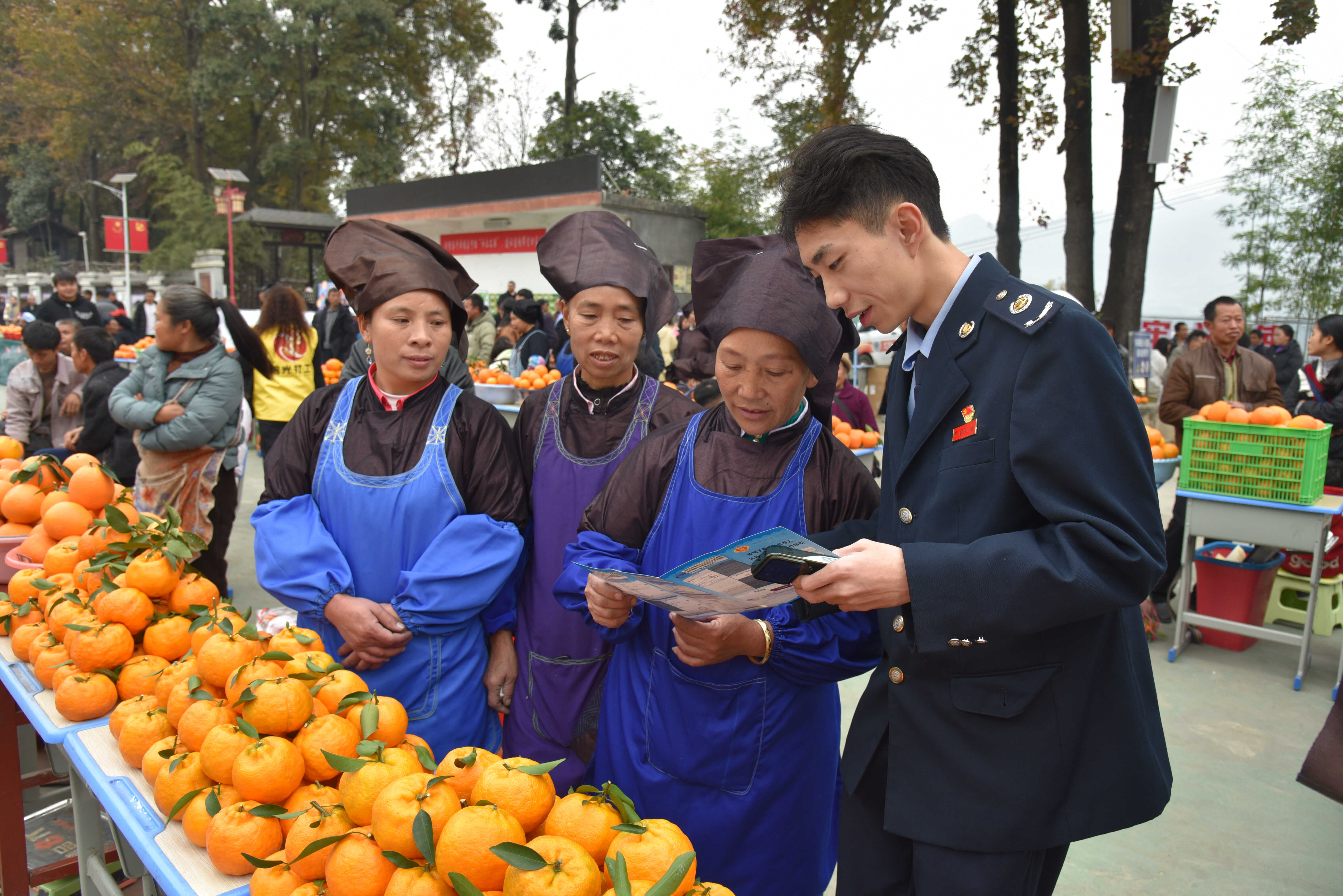 走进活动举办地鸡场镇学官民族中学,半包围、呈矩形的“脐橙展示展销区”围绕活动主舞台设立。黄澄澄的果子在一方方展示桌上堆叠成一座座小山,100多位参展果农或站或坐,与前来咨询问价的人热情交谈。其间一抹抹“税务蓝”穿梭往来,为大家讲解税收政策、解答涉税问题。