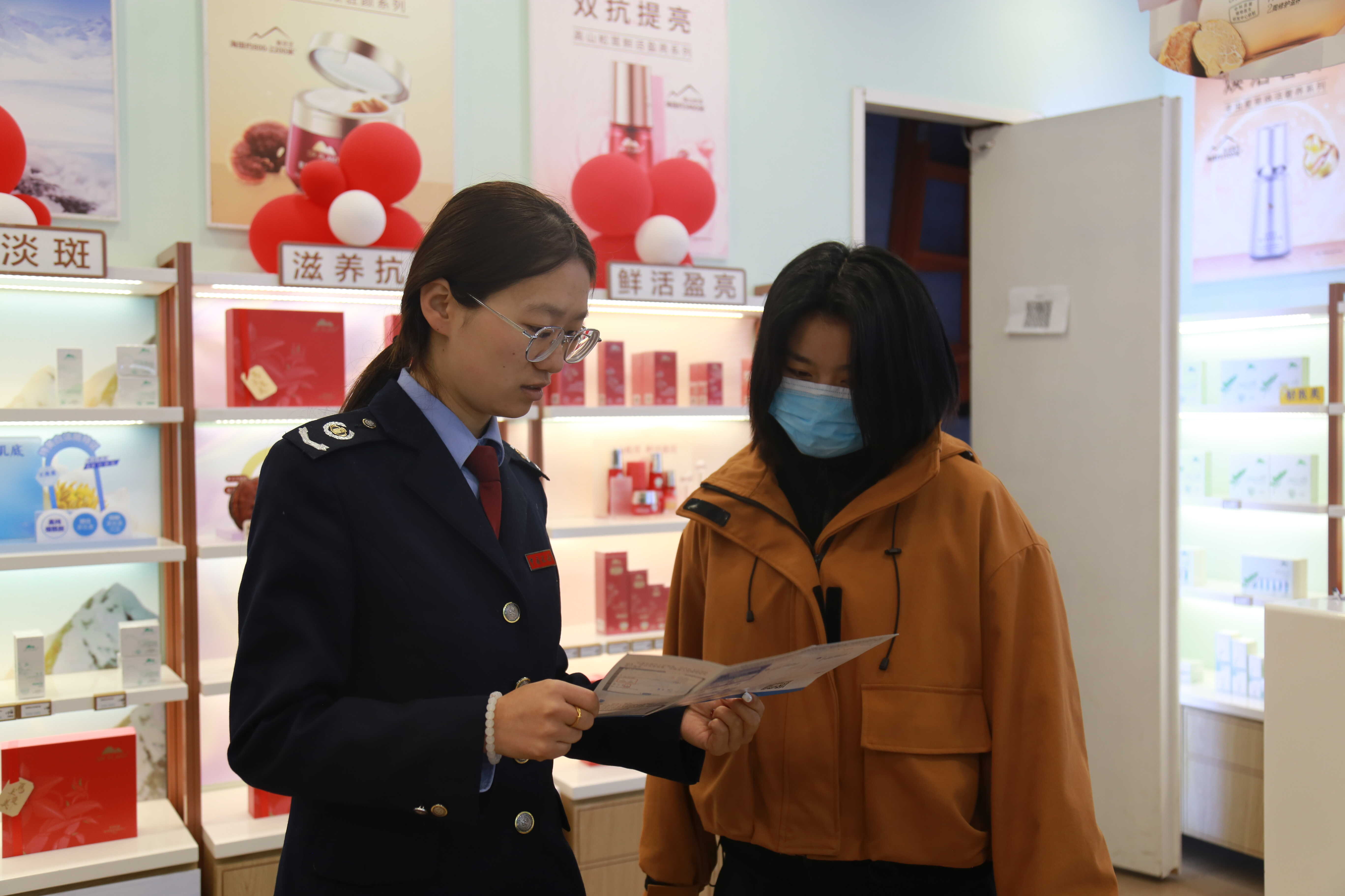 女税务干部们作为“合规辅导员”,穿梭在各女装店、化妆品店内,与女性经营者面对面交流,详细询问其经营状况和涉税难点,重点梳理了个体工商户涉税申报规范、发票管理要求等与商户密切相关的合规知识,用通俗易懂的语言讲解操作规范和注意事项,确保纳税人听得懂、守得牢。