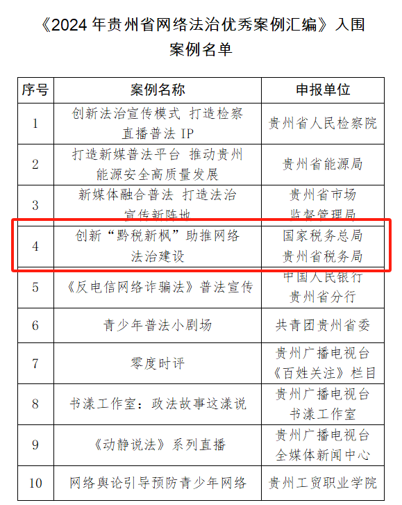 由贵州省委网信办主办的2024年贵州省网络法治优秀案例征集活动结果日前揭晓,国家税务总局贵州省税务局的《贵州省税务局创新“黔税新枫”助推网络法治建设》普法宣传案例成功入选。