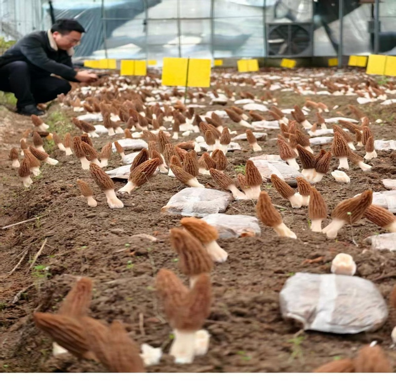 农艺师在种植基地查看羊肚菌生长情况。