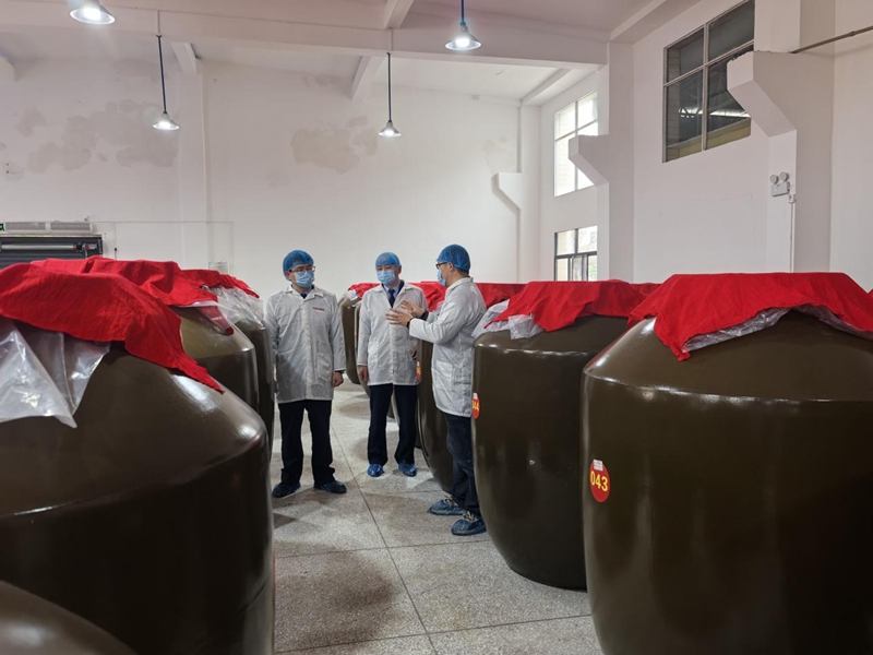 纳税人向税务干部讲解鱼酱酸装坛发酵原理。