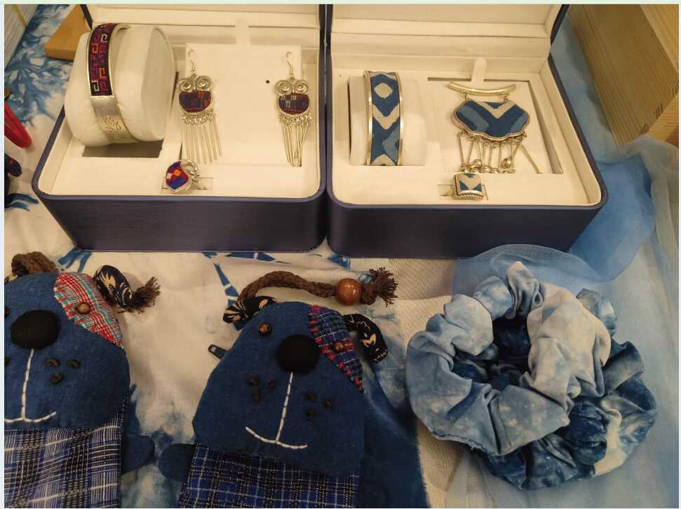 走进都匀秦汉影视城的贵州艾蓝文化创意有限公司文创门店,琳琅满目的文创产品映入眼帘,蓝靛染织的民族发饰、手工打造的苗银耳环、精巧玲珑的刺绣挂坠……浓郁的民族风情扑面而来,吸引了不少游客驻足观赏。