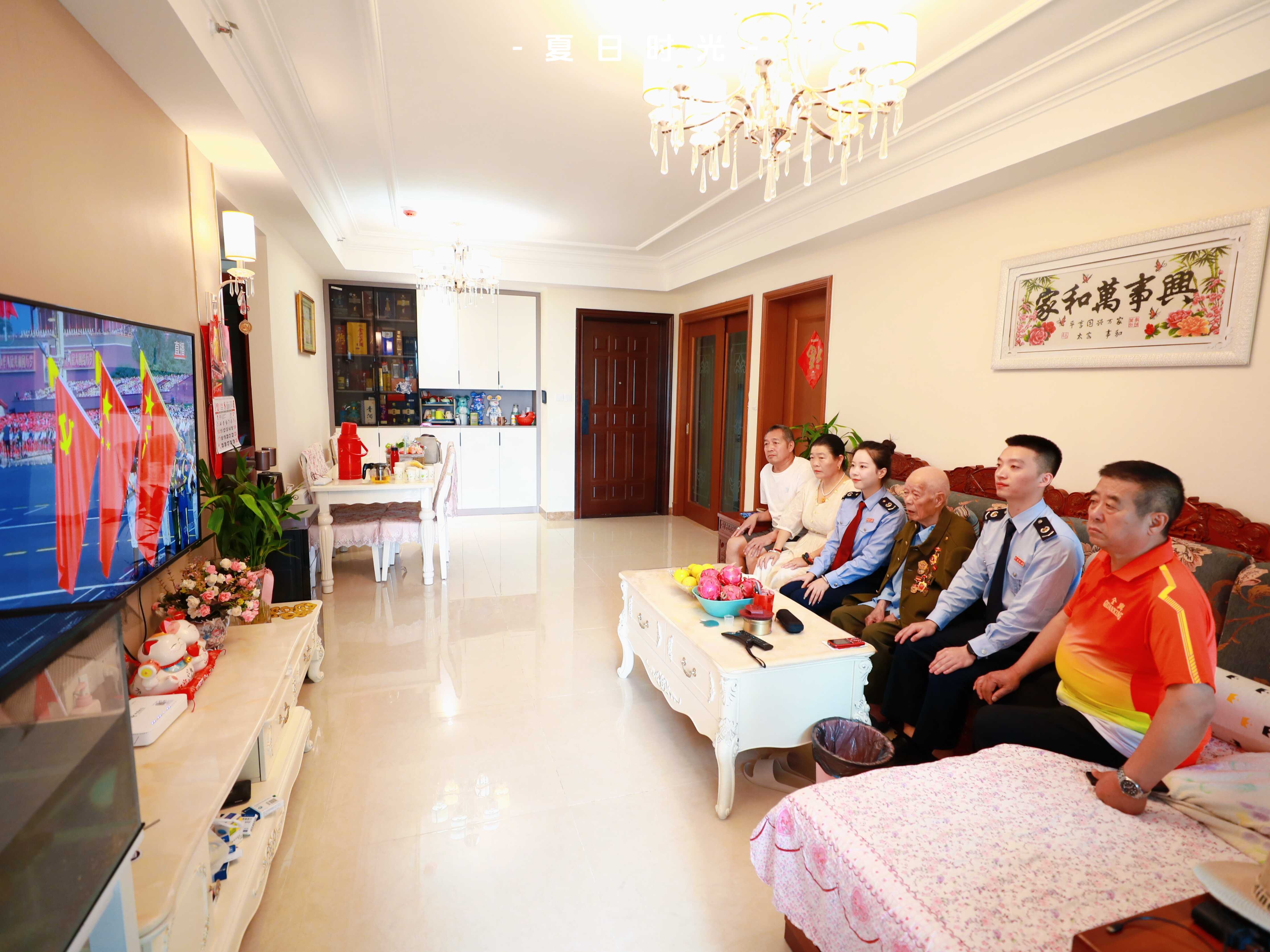 在离休干部、退役军人马洪亮家中,州县两级青年干部特意上门陪同这位身经百战、多次获得各类战斗模范称号的99岁老兵观看,听老人受到抗战精神感召入伍的感人故事,共同缅怀先烈,感慨和平的来之不易。当阅兵的画面出现在电视屏幕时,马洪亮老人热泪盈眶,他激动地说:“今天与大家一同观看阅兵,让我又怀念起过去在部队在战场上的时候。看到中国共产党带领人民奔赴国难,英勇抗战,我内心也燃起了熊熊火焰,所以我选择加入了部队,成为了一名光荣的解放军战士。我这把年纪,亲眼见证了我们的国家落后贫困到今天的繁荣富强,这个过程是艰难而不易的,向所有为祖国奉献牺牲的英雄们致敬!希望后辈们不忘历史,奋勇前行。”