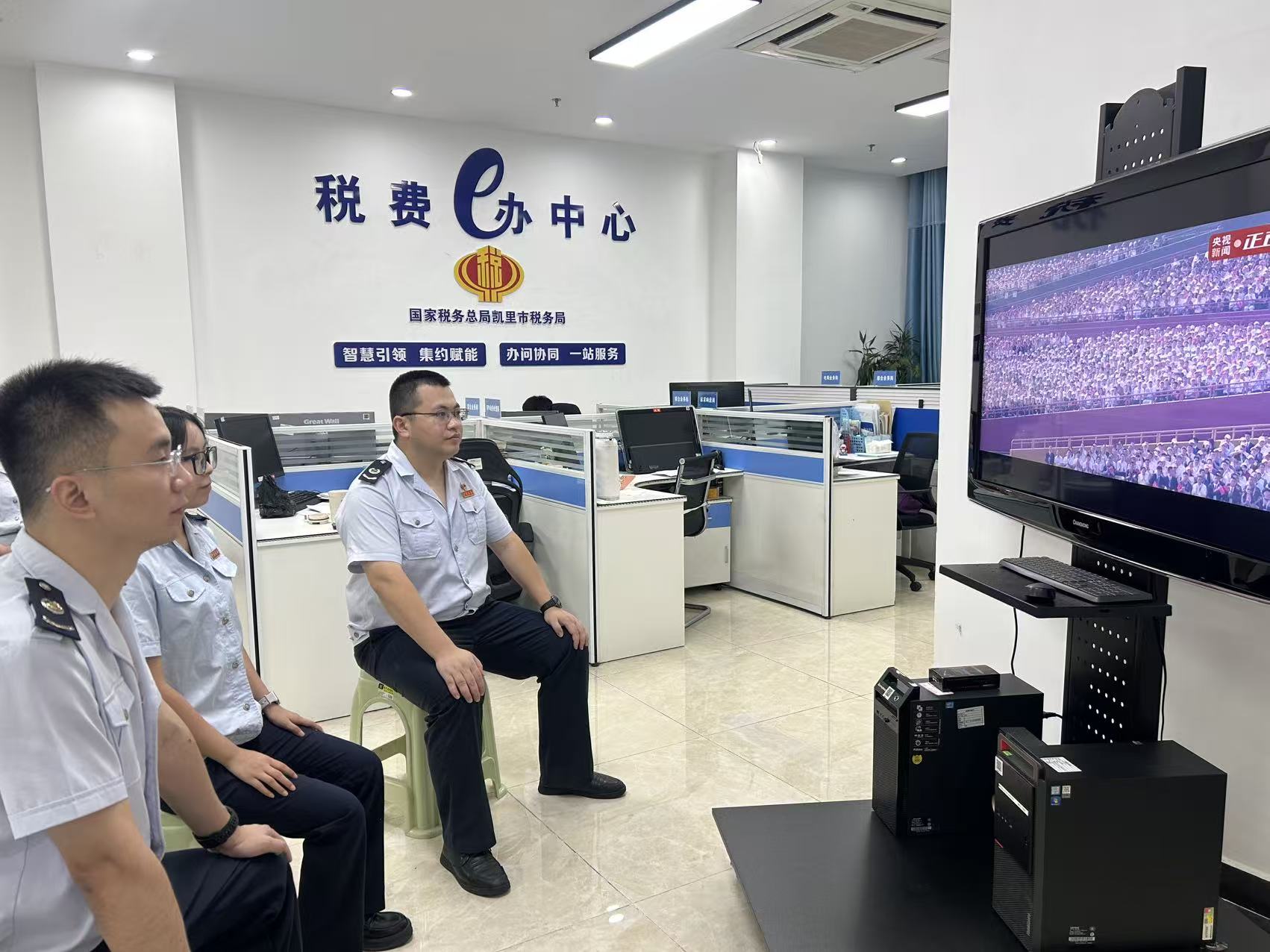 (图为黔东南州各县(市)税务局组织干部职工观看直播)