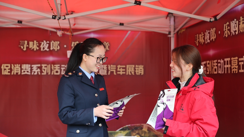 赫章县2026年“寻味夜郎·乐购赫章”新春促消费系列活动中,国家税务总局赫章县税务局深入活动同步跟进、主动靠前、精准发力开展税收服务,图为税务干部在入驻商户招聘时,向活动企划方了解活动详情,沟通活动辅导细节。