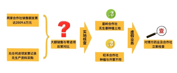 检查人员通过依法调取的银行流水查明,博方药业向星岭合作社支付款项累计359.66万元,这些资金先转入该合作社法定代表人的个人账户,经多个个人账户中转后,最终回流至博方药业法定代表人账户。而博方药业仅向旺禾合作社支付5200元,却取得了近千万元的农产品销售发票。