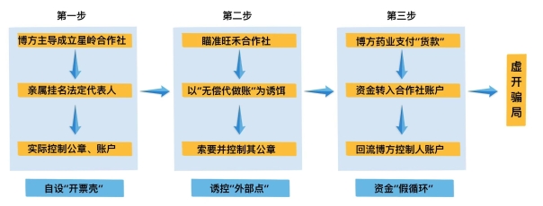 至此,博方药业精心设计的虚开链条逐渐清晰。第一步是自设“开票壳”。主导成立星岭合作社,将亲属登记为法定代表人,实际掌控公章、对公账户及相关个人账户,完全主导发票开具业务。第二步是诱控“外部点”。针对旺禾合作社法定代表人不懂财务的特点,以“无偿代理做账报税”为诱饵,索取合作社公章后实际操控开票,将其也纳入虚开渠道。第三步是资金“假循环”。此前流向星岭合作社的359.66万元为虚转资金,最终回流至博方法定代表人账户。通过织就关联网络,博方药业最终完成了这场虚开骗局。